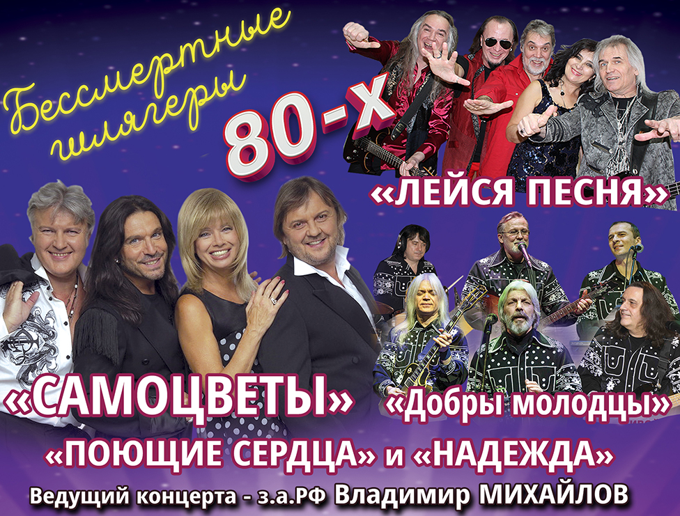 Артисты ВИА «ДОБРЫ МОЛОДЦЫ» исполнят не менее популярные шлягеры: «Прощальный вальс», «Главное, ребята, сердцем не стареть», «Люди встречаются» и другие. В разные годы в составе ансамбля работали Юрий Антонов, Олег Иванов, Жанна Бичевская, Алексей Глызин, Сева Новгородцев. В концерте выступит ансамбль, который сейчас возглавляет старейшина ВИА «Добры Молодцы», солист с 1978 года Андрей Кирисов. Их песни до сих пор на слуху у многих россиян.