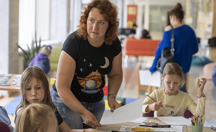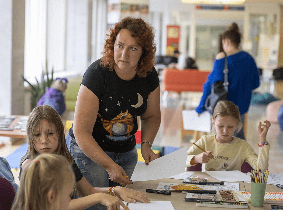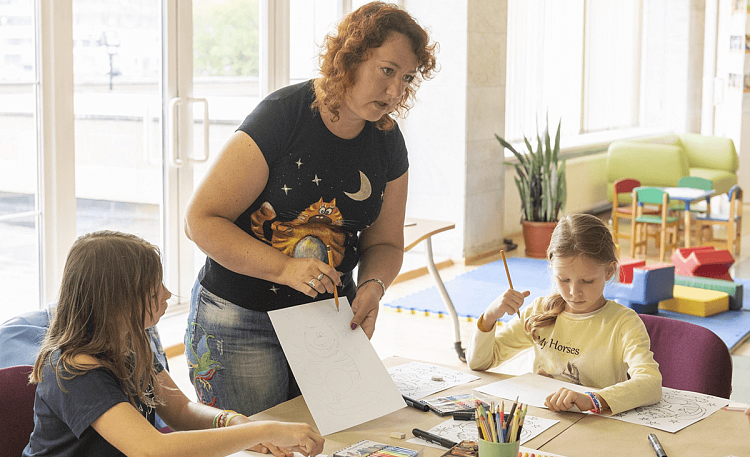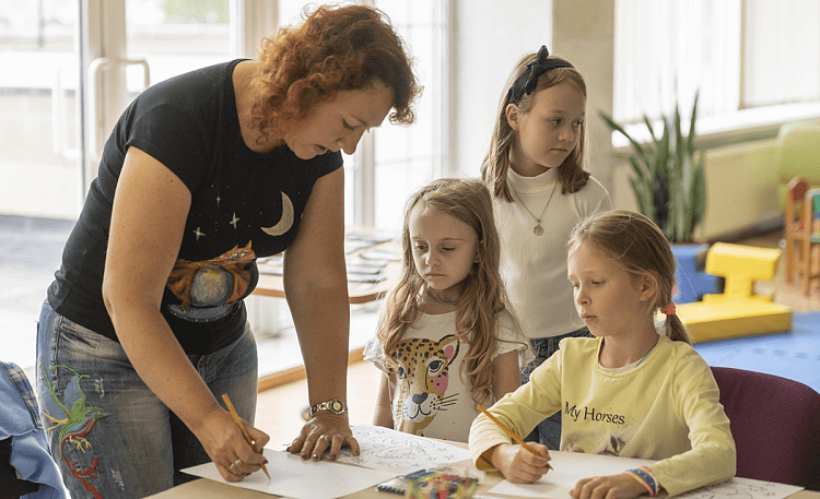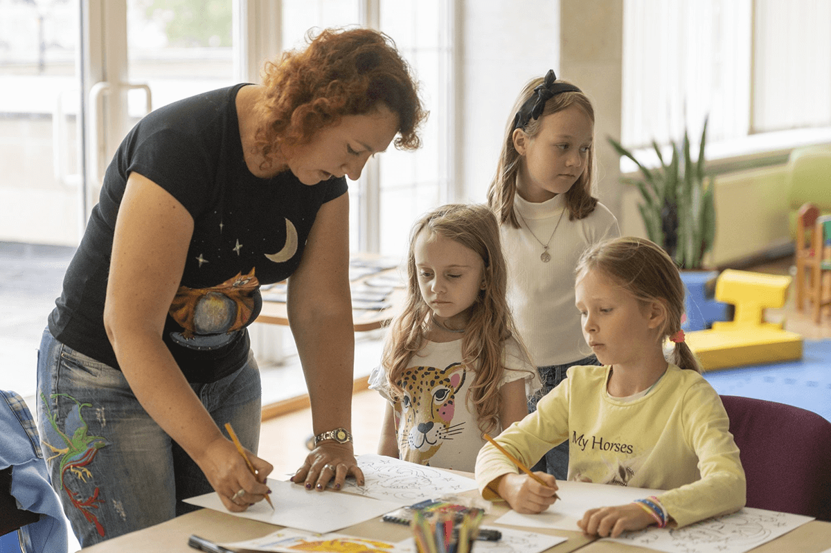 педагог рассматривает эскизы детей, поправляет ошибки